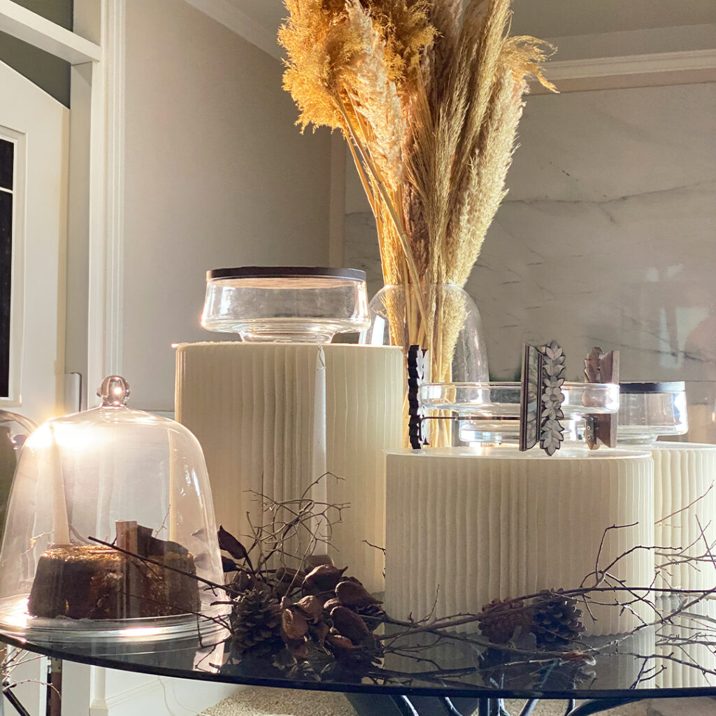لإضفاء لمسة طبيعية، قمنا بإدخال أواني طويلة بشكل حرف U مزينة بفروع الأغصان. إضافة مخلب الصنوبر على سطح الطاولة الزجاجية تعزز التصميم العضوي، جلبًا للطبيعة إلى داخل المنزل