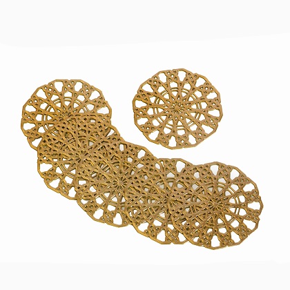 PVC coasters, in champagne color, comes in a set of 6, and has a diameter of 10 cm. The design in inspired for the Islamic geometric star.