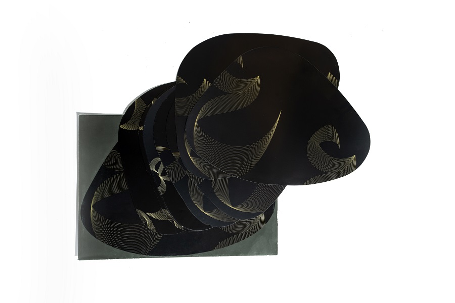 A set of 12 paper placemats, in an organic shape, with a grey base color and golden-print dotted Arabic calligraphy pattern.